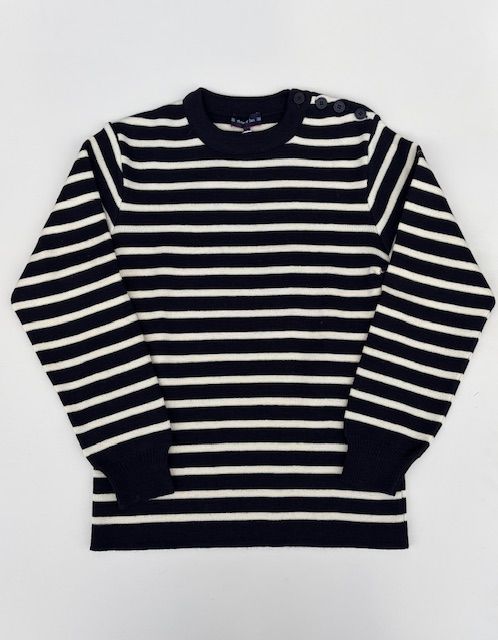 Genuine tight-fitting striped sailor sweater with a re-meshed crewneck, buttoned on the left shoulder with four natural corozo buttons, straight edge hemline.